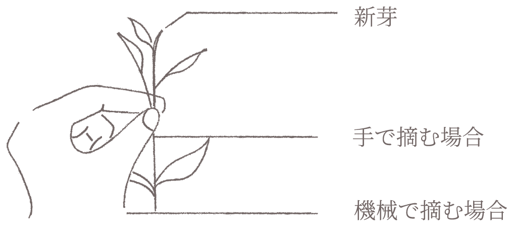 新芽の柔らかい部分のみを均等に一葉ずつ手で摘み取る。